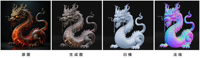 龙形模型在结构、纹理与材质上呈现高度一致性,整体盘绕姿态与体块关系清晰,鳞片、角、须等复杂细节严格依附于几何结构生成,而非简单叠加。纹理随结构同步“生长”,没有拉伸或错位。即使在灰模状态下,模型仍保持完整体积与层次,生成后即可直接进入打印与生产流程。