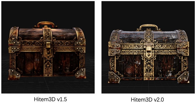 在木箱主体上,Hitem3D 2.0 对材质与结构关系的处理更加自然。木板的年轮走向、拼接关系与箱体结构保持一致,表面磨损集中于边缘与底部,更贴近真实使用痕迹。相比之下,2.0 中木材呈现出清晰的板材逻辑与时间感,使木箱从“渲染物件”更进一步,接近真实可生产的三维资产。